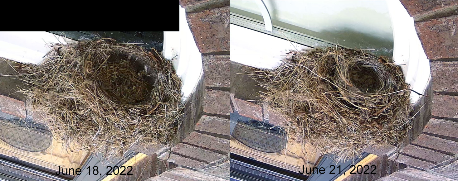 The nest sat idle for a while after the robin chicks fledged. During this idle time, I upgraded the camera to new one that include sound. I was thinking the robins might have a second brood in the same nest. The second brood did not happen but interestingly, a pair of Finches discovered the nest. They did a little remodeling on it and got it ready for their eggs. The Finch timeline starts here